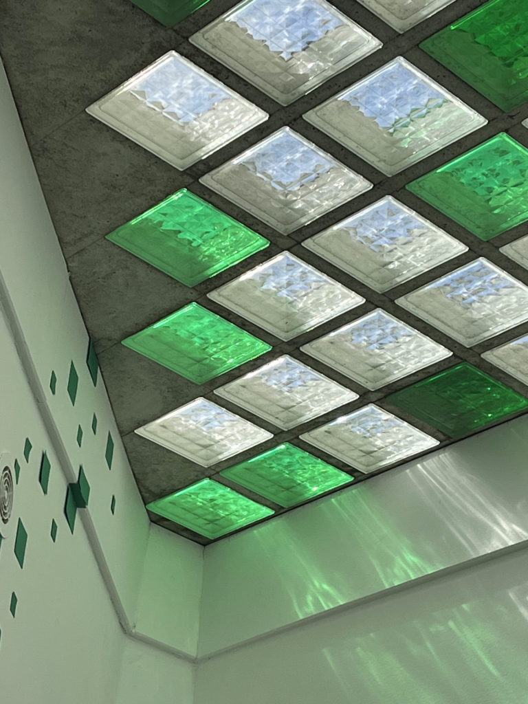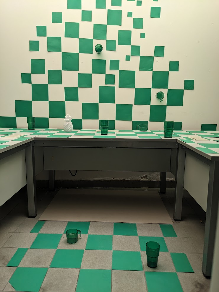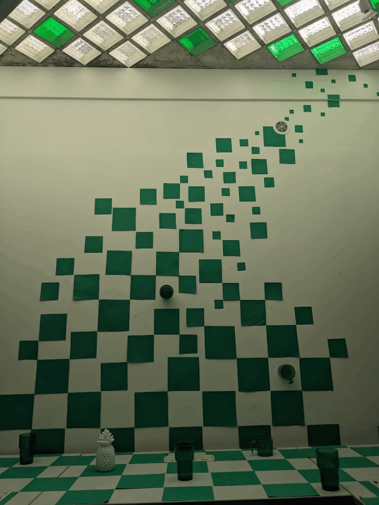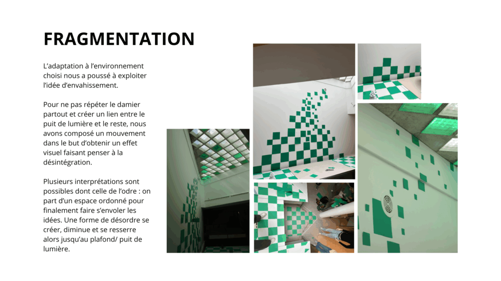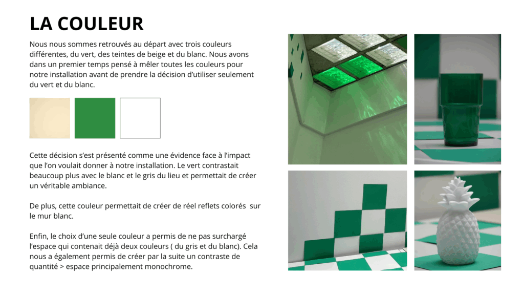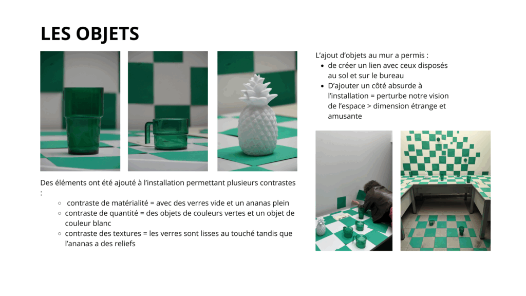 Voici un exemple d’installation que j’ai réalisée en DN MADE, en groupe. « Échec et vert » explore le motif du damier avec une approche contemporaine. Nous avons voulu créer un spectacle visuel à la fois vibrant et géométrique, où le vert domine presque en monochromie. Les objets intégrés apportent à l’ensemble une dimension étrange, mystique, avec une pointe d’humour. L’installation se déconstruit progressivement, fragmentant l’espace et offrant aux spectateurs une expérience dynamique et immersive.